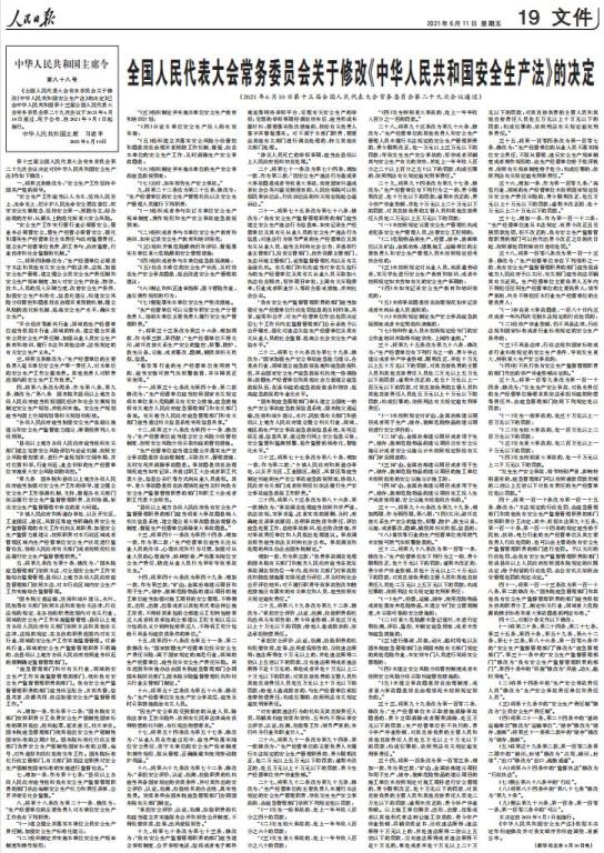 6月10日,十三届全国人大常委会第二十九次会议审议通过了关于修改安全生产法的决定,修改后的安全生产法将于2021年9月1日起施行。