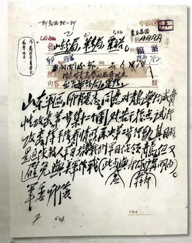 1949年5月3日,人民解放军兵分三路,发起青即战役。图为青即战役经过要图。青岛市档案局副局长杨来青:4A是最急要的电报,它的意思实际上是刻不容缓、十万火急这个意思。青岛这个战事它不是打歼灭战,而是把敌人赶走,所以叫威胁性攻击。这个主要是什么原因呢?是由敌强我弱这个态势决定的。
