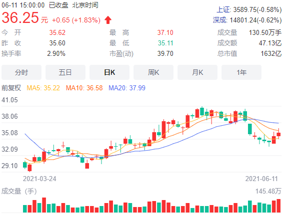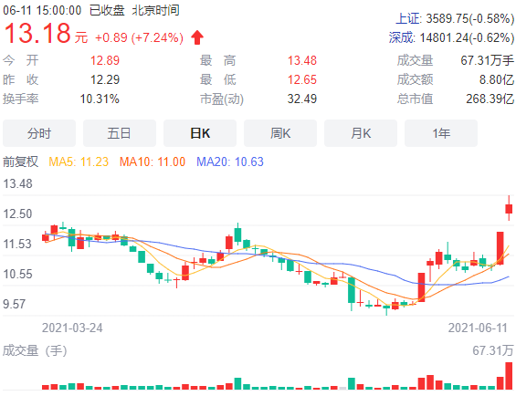 6月11日,爱旭股份股价大涨7.24%,收于13.18元/股;通威股份收报36.25元/股,涨1.83%。