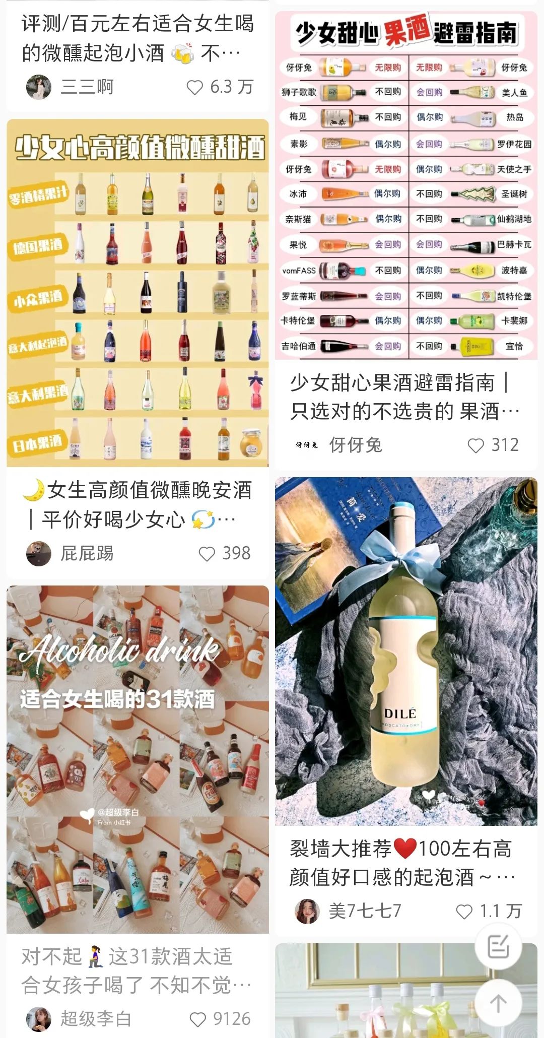 在小红书、微博等平台搜索“女生酒”,映入眼帘的是各式花花绿绿的瓶子,被推荐的大多数是低度果酒,偶尔夹杂着气泡酒和精酿啤酒。