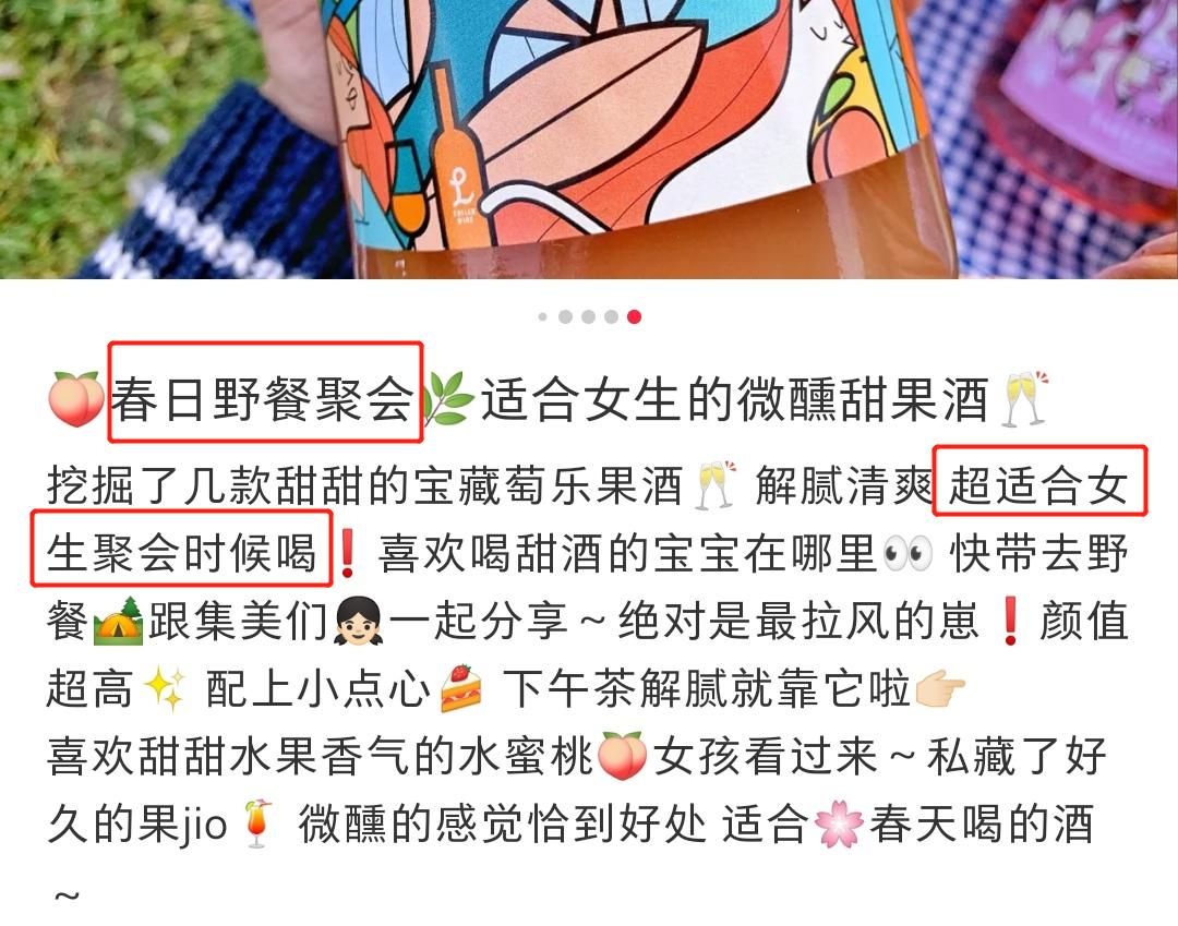 也可能是深夜结束工作后,坐在飘窗边上独自小酌,将窗外星空尽收眼底。几杯下肚后,困意袭来,沉沉睡去。在小红书的笔记中,闺蜜聚会、外出野餐、睡前小酌都是女生们常见的喝酒理由。