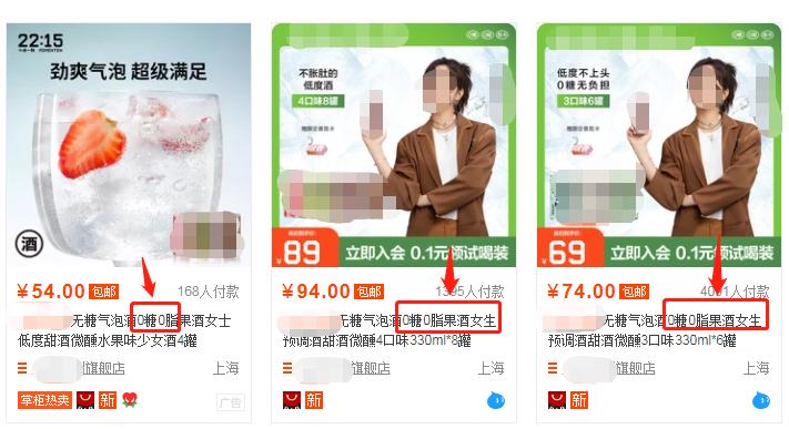小新在淘宝搜索小红书博主推荐的某款气泡果酒,发现在旗舰店的商品链接中,标题出现了“0糖0脂”“女士”“少女酒”等关键词。
