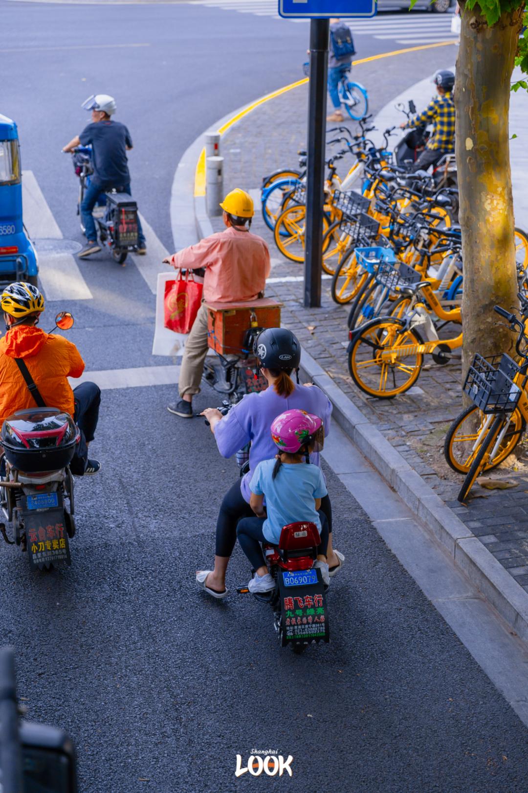 擦肩而过的路人妈妈后座快乐下课的小朋友