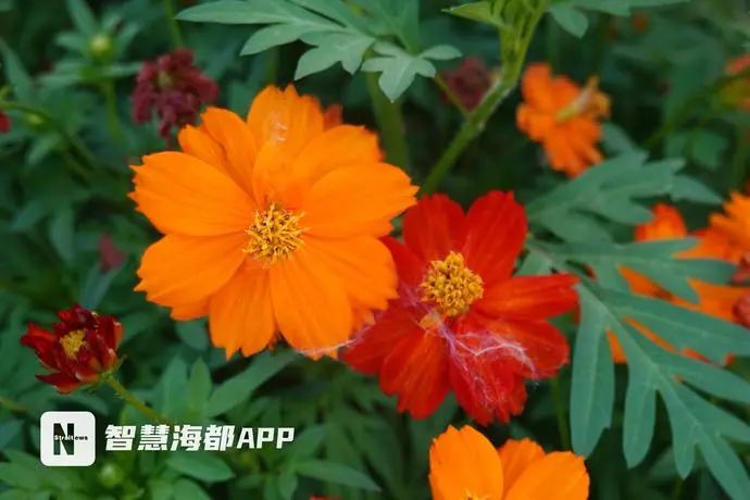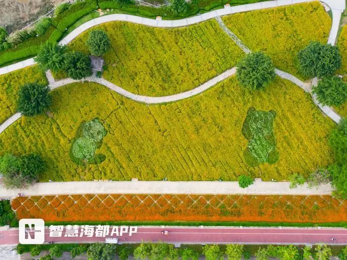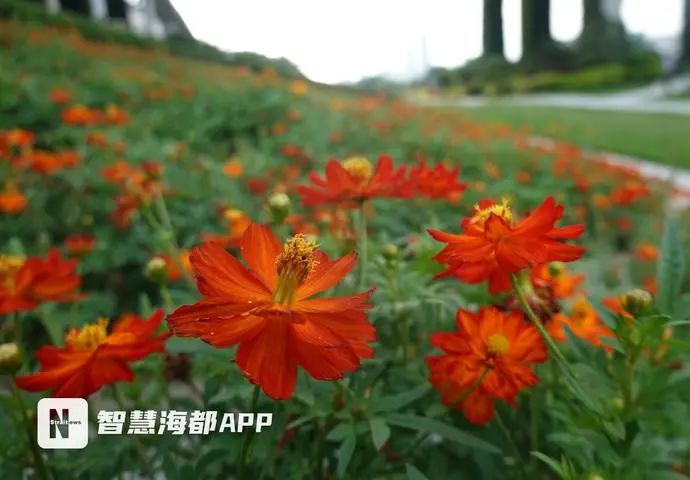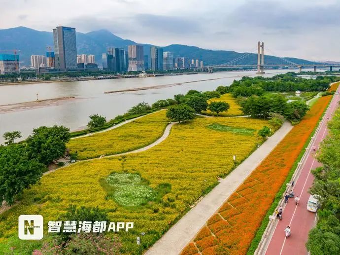 今年,花海公园中,秋英属的植物一共有五种色彩。其中,硫华菊有橙红色、橘色、黄色三种,黄色和橘色品种主要分布在花田中,而橙红色的则种植在斜坡花田,两种暖色系的植物,和蓝天、绿荫以及闽江江景融为一体,带来活力且清爽的夏日景色。