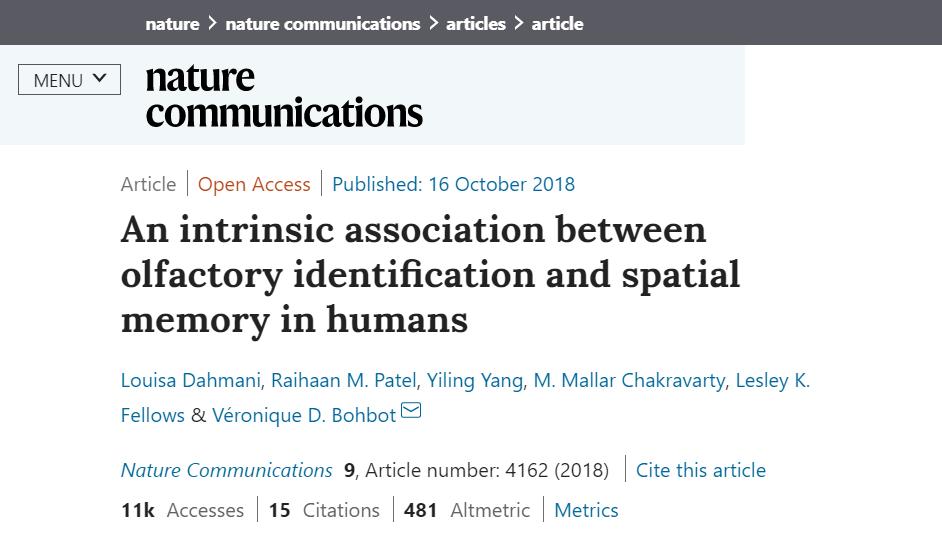 [1] Dahmani L, Patel R M, Yang Y, et al. An intrinsic association between olfactory identification and spatial memory in humans[J]. Nature communications, 2018, 9(1): 1-12.