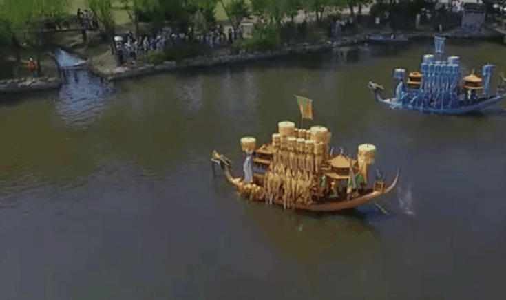 船队行进时,数船配合,交叉往返,旋转迂迴,变换出各种姿态,或同向追逐,或相向穿行,或顺流竞驶,或逆水调头。