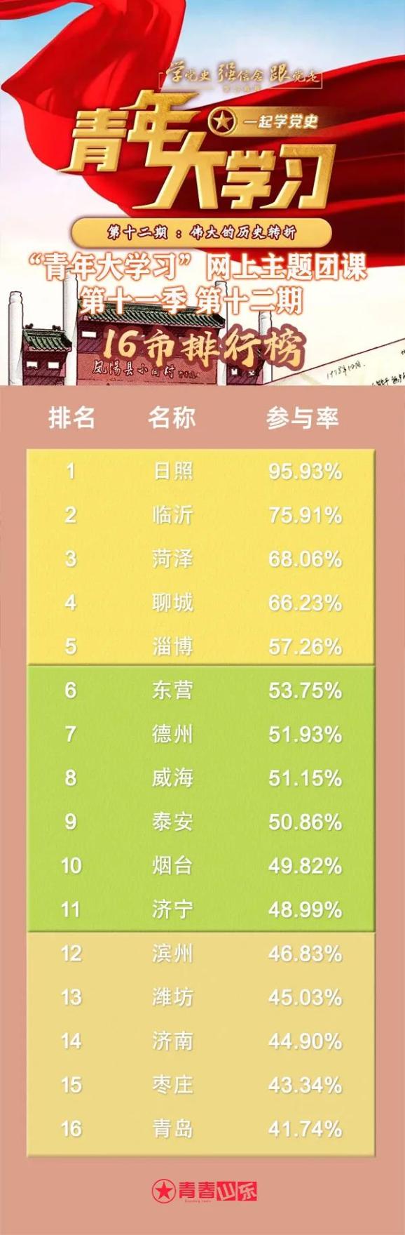 第十一季第十二期“青年大学习”,我们来到了“中国农村改革第一村”安徽省滁州市凤阳县小岗村,一起了解了改革开放的时代巨幕是如何拉开的,共同学习了以“伟大的历史转折”为主题的网上团课。进入6月,各学校陆续进入考试季、毕业季,工作学习任务重,多个高校、市县大学习参学率出现一定程度的下滑。请大家努力克服,扎实推进,让我们共同加油,争取在下一期的学习中取得更好的成绩!(
