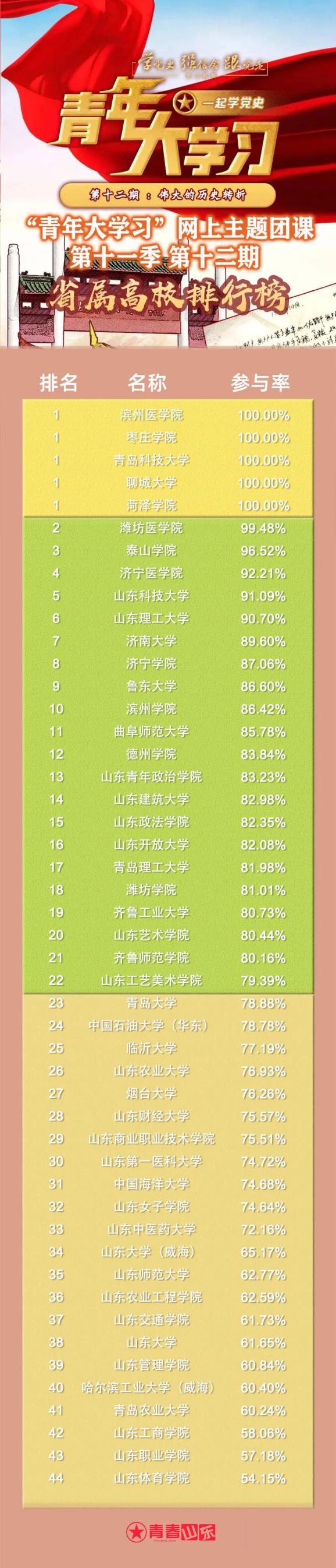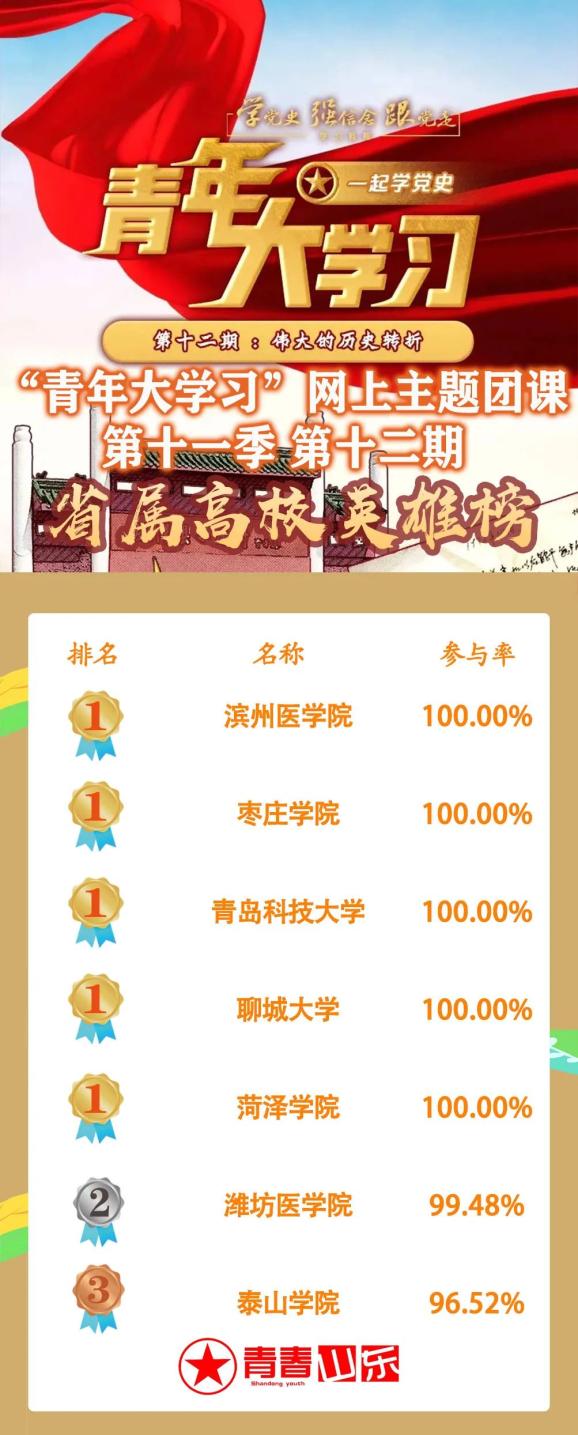 省属高校中,45所高校参学率达到60%以上,其中,参学率在90%以上的学校达到10所。滨州医学院继续高居冠军宝座,枣庄学院紧随其后,获得亚军,青岛科技大学本周反超聊城大学跃居第三。排名第四和第五位的分别是聊城大学、菏泽学院,且参学率均达到100%。此外,济宁医学院的参学率与上期相比提高了6%以上(