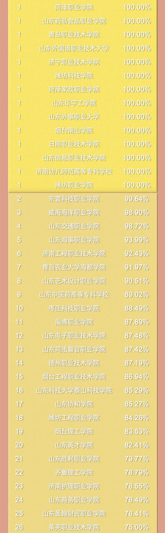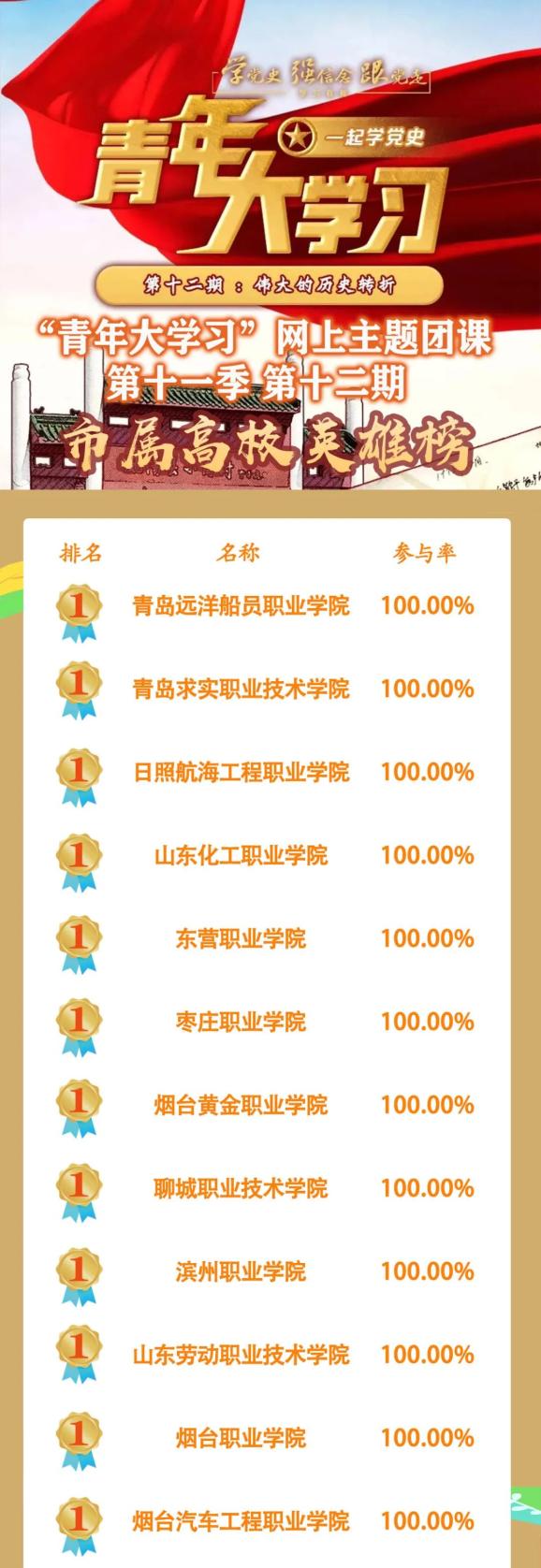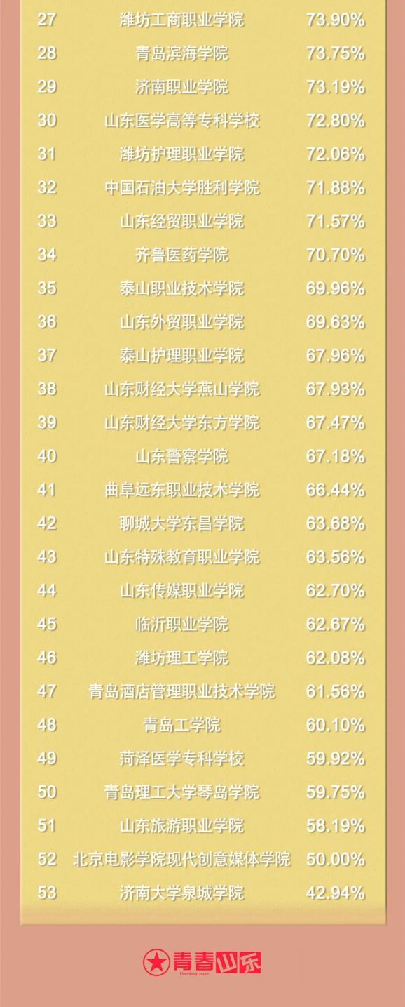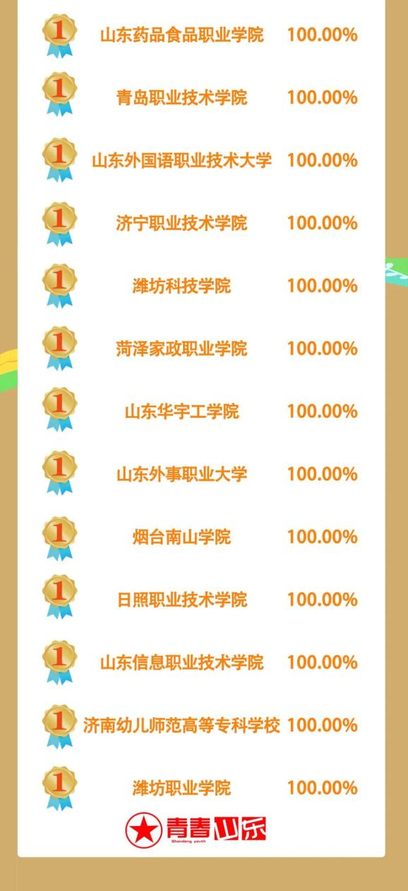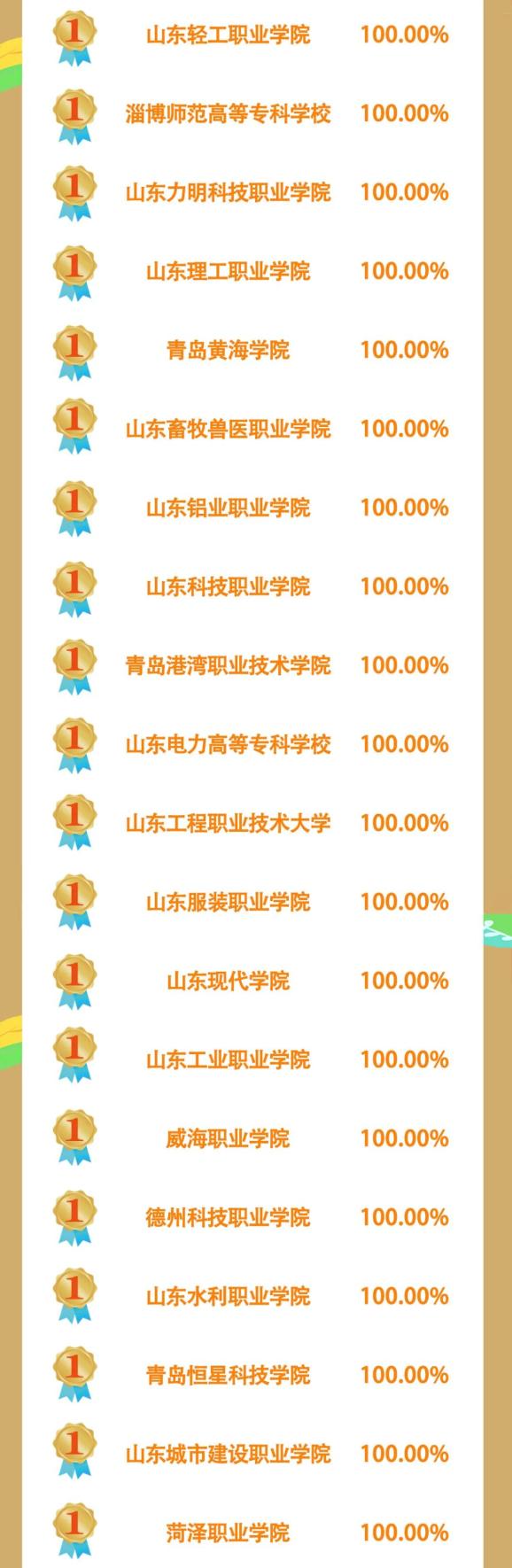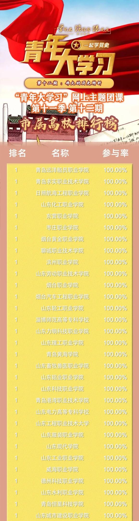 市属高校中,参学率达到60%以上的学校有92所,其中,参学率达100%的学校有45所。青岛远洋船员职业学院继续强势领跑;青岛求实职业技术学院不甘示弱,紧随其后;排名第三位的是日照航海工程职业学院。此外,山东服装职业学院的参学率与上期相比有了惊人的增长,提高了57%以上(