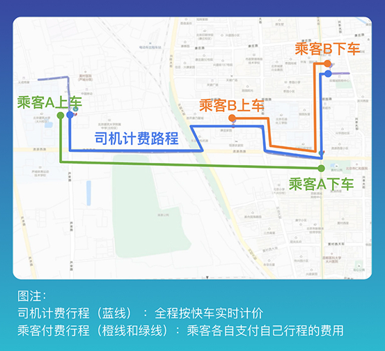 简单来说,从乘客A上车点到乘客B下车点,是司机的计费行程,根据快车实时计价规则,按照实际行驶里程和时长计算司机的收入。也就是从第一位乘客上车,到最后一位乘客下车,全行程按快车实时计价。