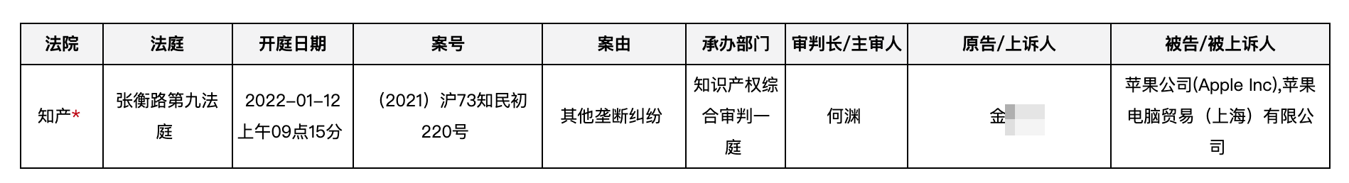6月16日,澎湃新闻记者从上海市高级人民法院网开庭公告获悉,2022年1月12日,原告金某与被告苹果公司(Apple Inc)、苹果电脑贸易(上海)有限公司(以下简称“苹果上海公司”)垄断纠纷案将在上海知识产权法院开庭审理。
