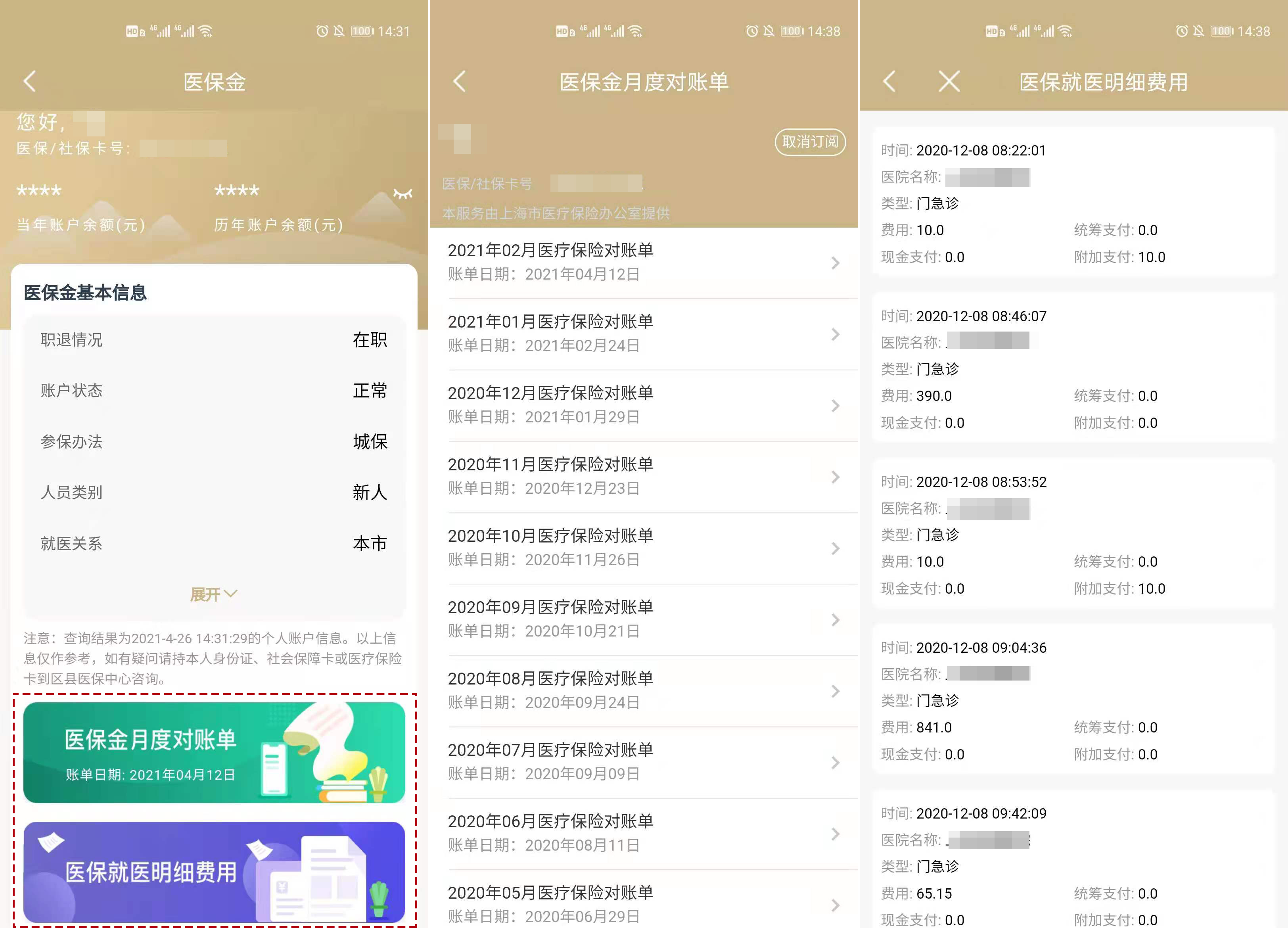 点击“医保金”页面下方的“医保金月度对账单”,可查询每月医保金的缴纳情况和金额。