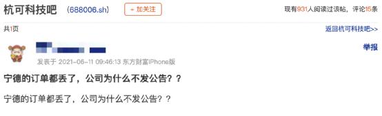 不过,值得注意的是,似有股民提前在股吧中提前透露消息。在6月11日,便有人发文表示,“宁德的订单都丢了,公司为什么不发公告??”下面还有人回应称,“之前公布的订单,宁德已经退订了,全部的设备。”订单解除一事究竟是股民的猜测,还是消息走漏提前得知,还有待考证。