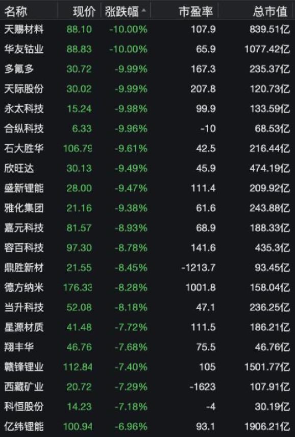 今日,锂电池板块早盘走低,截至午间收盘,天赐材料、天际股份、永太科技等纷纷跌停,另外宁德时代跌3.73%,比亚迪跌5.3%,亿纬锂能跌6.96%。