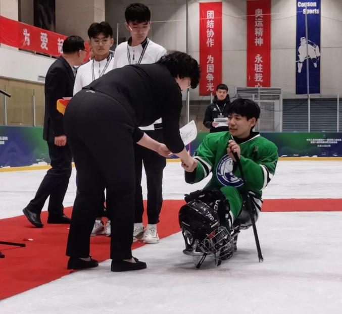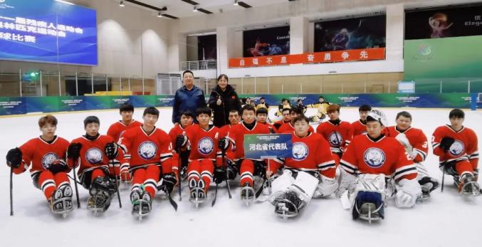 河北省残疾人文体中心主任张连歧、承德市残联党组书记、理事长祁春艳与河北省残奥冰球队员合影留念