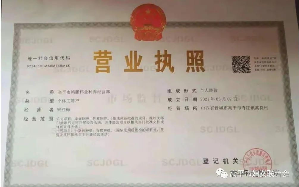 一直就有想法的她,说干就干,她决定以梨产业为基础,增加其他种植种类,同时发展养殖。参加完培训,紧接着她就外出考察,调研市场,学习技术,请种养殖技术人员实地指导。高平市妇联主席王霞知道她的想法后,全力支持她,多次到高良村调研,积极协调人社局等相关单位,为宋红梅解决创业过程中遇到的困难和问题。经过两个月的努力,今年5月,高平市鸿鹏伟业种养经营部正式成立。