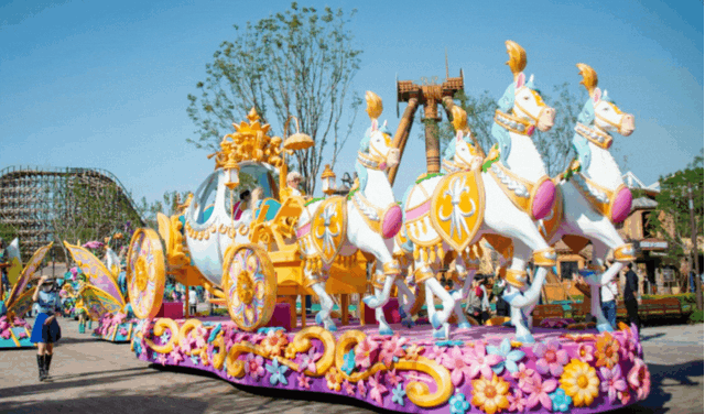 既然不要大门票,巡游自然就是免费看。花车巡游是融创乐园演艺项目的TOP1,巡游主题是婚礼,能巡游园区的三分之一。