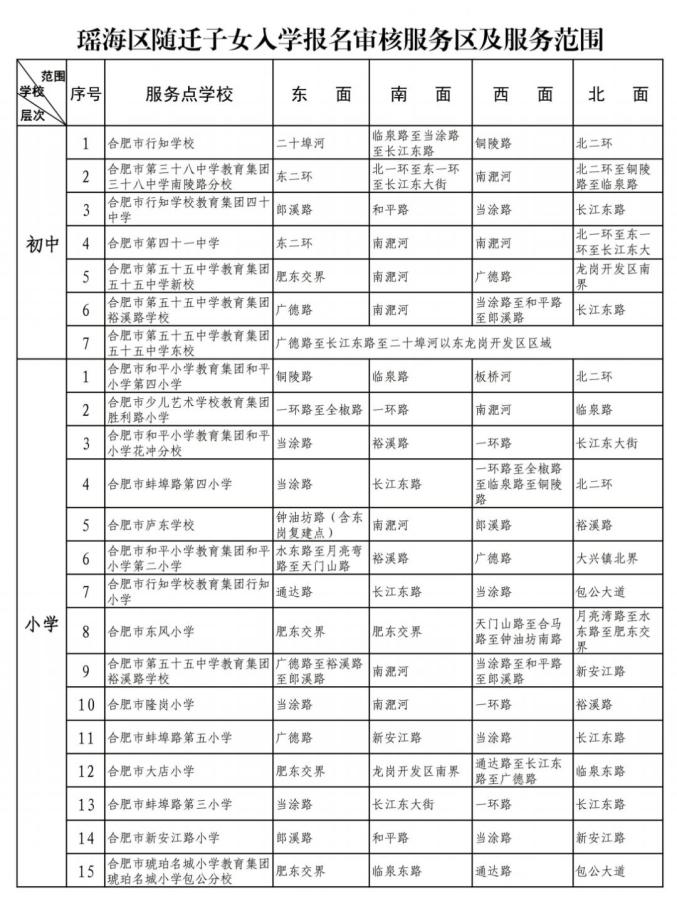 19.合肥市青年路小学教育集团锦城小学:关麓路经阊水路至宿松路以西,十五里河以北,金寨路以东,南二环路以南(含南二环路以北仰光社区东风居民组)。