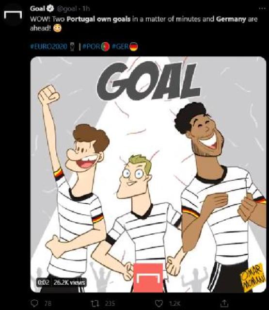 《球门》周刊:“哇!几分钟时间内葡萄牙的两个乌龙球,然后德国领先了”