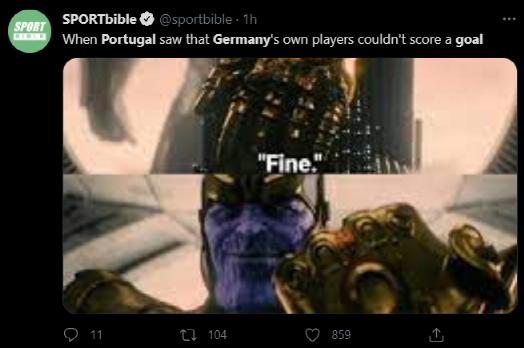 英国“足球圣经”网站则将葡萄牙队比作漫威人物灭霸:“当葡萄牙看见德国自己的球员没办法进球时...”,配图中灭霸微微一笑、握着拳头说道:“好吧。”