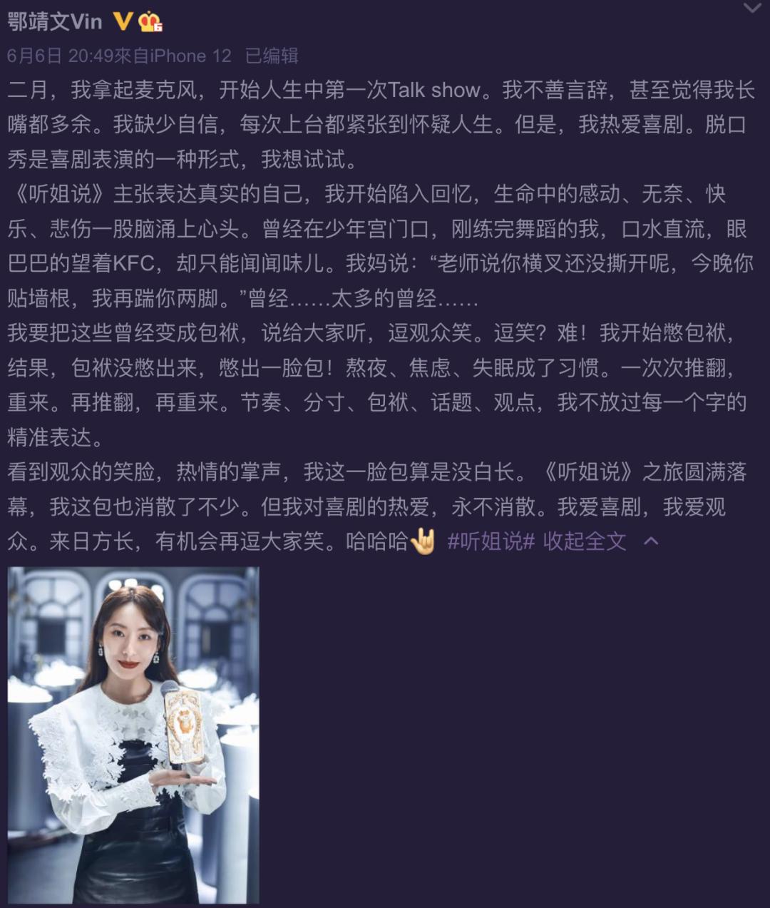 在她最近参加的一档女性脱口秀节目《听姐说》里,原本喜剧是强项的她,却最终遗憾止步于半决赛。