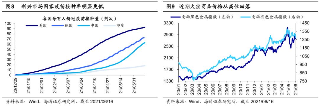 这次疫情冲击下的全球经济同样经历了“危机→放水→复苏→通胀”的过程,但不同之处在于,由于各国疫情防控措施不同以及病毒的变异,这次后疫情时代的各国经济复苏是明显更缓且不同步的。我国防疫措施最好,复苏最快,2020年我国是全球唯一实现GDP正增长的国家。美国等发达国家防疫政策有效性不及我国,复苏节奏略落后,2020年GDP增速是负数,但世界银行预计2021年美国GDP的两年年化增速大致能回到疫情前的水平。而大部分新兴市场国家由于防疫政策落后和疫情反复,世界银行预计20-21年GDP两年年化增速仅在0%左右,经济增速真正开始上升可能要等到2022年及之后。因此,相较09-11年,当前这种复苏的大幅错位会使得本轮全球复苏时间拖得更长,斜率更缓,对应通胀的上升可能也更为温和。前期商品涨价部分源自 “碳达峰、碳中和”政策和供应链受损等因素扰动,目前随着监管政策趋严,近期国内商品价格已明显回落,下半年通胀压力将下降,整体看我国今年仍将处在过热期。