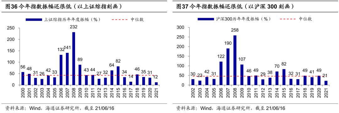 参考历史年度振幅,今年指数再创新高概率偏大。统计A股各主要股指在2000- 2020年间每一年的振幅(年内最高价相对最低价的涨幅),上证综指2000年以来年振幅基本都在25%以上,沪深300振幅30%以上,万得全A也在30%以上。今年以来前述三大指数的振幅分别只有12%、21%和15%,如果前期低点有效(今年上证综指的低点是3月9日的3328点,沪深300在3月25日的4883点),那参考历史股指的波动幅度,今年股市还有进一步向上拓宽的空间。