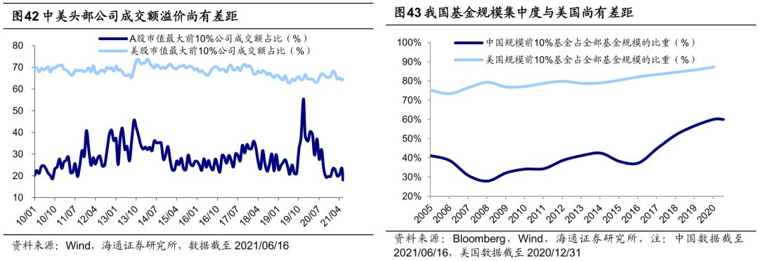 注册制、机构化+国际化导致A股个股及基金分化。①注册制实施之前,IPO核准制极大地增加了企业的上市成本,不少企业会另辟蹊径、寻求借壳上市,因此即使上市公司运营不善,也具有可观的“壳价值”。2019年来,注册制的推进使得“壳价值”被极大压缩,上市公司股价表现与基本面的联系进一步加强。②A股机构化和国际化趋势显著:过去几年来,A股中机构投资者占比不断上升,公募、外资、保险公司三大机构投资者在A股总市值口径下的持股市值占比从11年的5.3%上升到20年的15.1%。机构化、国际化的加速推动了头部个股涨跌幅和基金净值变化的分化,还加速了个股成交额和基金规模向头部集中的趋势。展望未来,A股个股及基金的分化趋势还将延续。目前我国无论是个股还是基金的分化程度均与美国有差距:截至2021/06/16 A股市值前10%/前30%的公司成交额占比分别为43%/72%,而美股分别为69%/92%; 2020年我国基金规模前10%/30%的基金占全部基金规模的比重分别为60%/84%,美国分别为87%/97%。近年来我国大力发展直接融资,稳步推进注册制,配合完善信息披露、发行、退市等制度,与此同时A股机构化、国际化的空间也很大:目前外资持股占A股总市值的比重6%,仍明显低于中国台湾、中国香港、韩国股票市场中外资占比。以上因素推动下,未来我国股市两极分化的马太效应将更加显著。