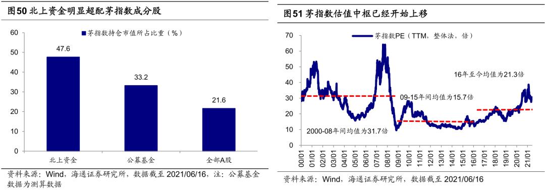 当前A股出现新分化,展望21年下半年,我们认为守正出奇方能致胜。守正出奇即以茅指数为代表的第一梯队超大市值公司仍然值得配置,但产业升级大趋势下,中大盘中的智能制造才是获取超额收益的关键。守正:茅指数为代表的龙头优质公司。今年02/18后,茅指数深度回调,有部分投资者认为茅指数成分股估值太贵,下跌预示着好景难在。但我们认为在稳定业绩和外资偏好的支撑下,茅指数走势逐渐美股化,春节后的回调只是性价比的自我修正,未来有望进一步上涨。回望2016年来茅指数表现,其走势渐渐美股化。2016年之前茅指数波动较大, 05-07年牛市中,茅指数翻十倍后跌去近七成;12-15牛市中,茅指数翻三倍后跌去近四成。但2016年至今茅指数逐渐显现长牛趋势,走势与美股纳斯达克指数相近,均在快速上涨之后进入调整稳固阶段,随后再创新高。茅指数逐渐美股化的重要原因是龙头公司业绩更优以及外资的持续偏好。当前我国经济发展从增量走向存量,在此背景下龙头公司业绩更优,而茅指数正是优质龙头公司的集合。从业绩看,茅指数成分股ROE更优,茅指数成分股中日常消费/工业/信息技术行业ROE(TTM,整体法,下同)分别为29%/19%/16%,均高于全部A股行业整体18%/6%/6%。茅指数成分股凭借优异的质地和良好的盈利能力吸引了外资的持续配置。北上资金持股市值中,茅指数成分股占比达47.6%,而茅指数成分股总市值占全部A股的21.6%,可见外资明显超配了茅指数成分股。我们在前文中提出在基本面、利率、居民资产配置偏好等因素的影响下,A股未来有望类似1980s美股,估值中枢逐渐上移。目前在外资持续超配之下,估值中枢上移已在茅指数上有所体现:茅指数PE(TTM,整体法)中枢从2000-08年底的31.7倍降至09-15年间的15.7倍,但16年至今已经上移至21.3倍。未来随着A股机构化、国际化趋势逐步演进,以茅指数为代表的龙头公司长牛特征将越来越明显,春节以来的回调只是性价比的自我修正,长期看仍然值得配置。