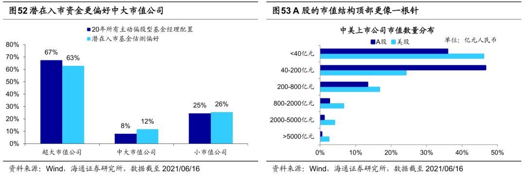 出奇:中大盘性价比更高。随着经济逐渐步入正轨,以茅指数为代表的超大盘股在基本面上的相对优势不会像去年那么极致。我们测算超大市值公司21Q1归母净利润两年年化增速为15%,当前PE(TTM,整体法,下同)为29倍,中大市值分别为19%、27倍,小市值为6%、50倍,中大市值个股业绩改善较为明显。此外,我们测算了潜在入市基金的市值偏好,目前全市场所有主动偏股型基金、潜在入市基金对于超大市值公司的配置力度分别为67%/63%,中大市值公司为8%/12%,小市值公司为25%/26%,中大市值公司更受到资金偏好。同时从市值结构来看,目前A股的市值结构顶部更像一根针,超大市值公司数量占比约4%,中大市值公司数量占比约13%,小市值公司约47%,40亿以下36%,而美股的市值结构呈现出更均匀的“金字塔型”。参考美股,未来A股第二档即200-800亿的中大市值的公司有望进一步变大变强。