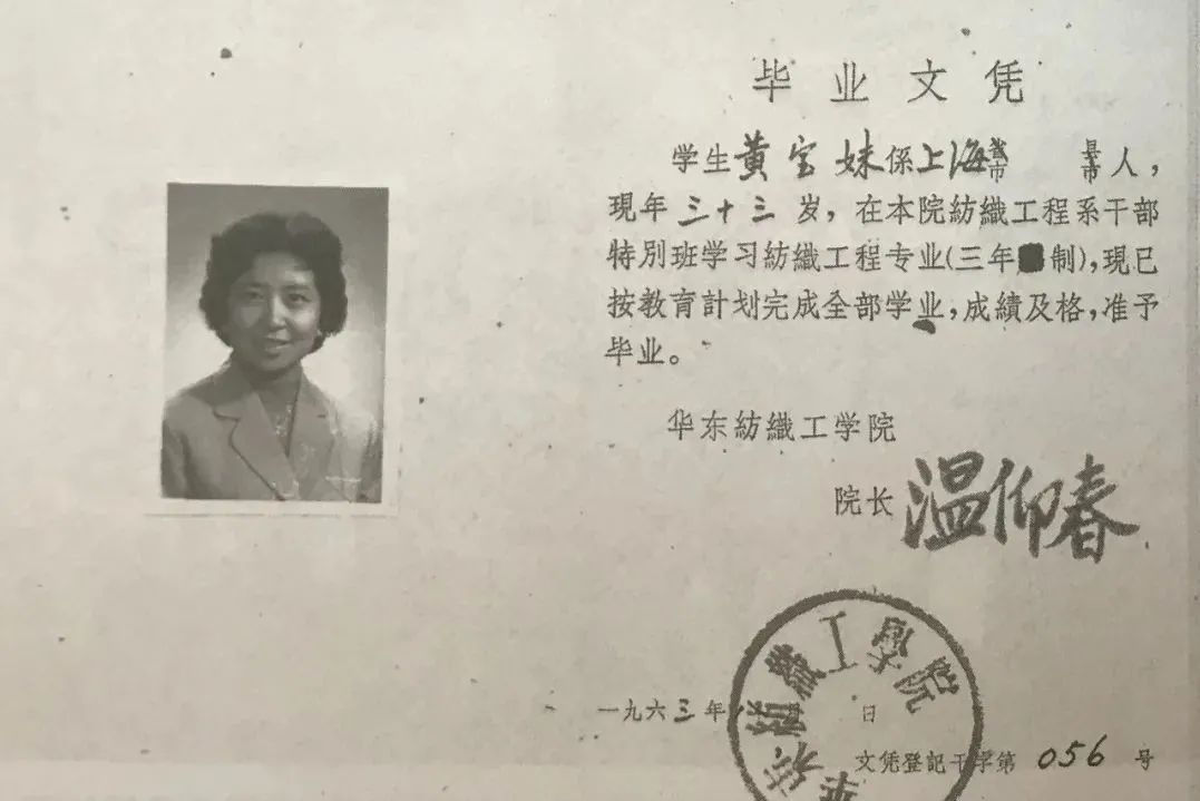 黄宝妹(下排左三)的大学合影1960年-1963年,黄宝妹作为优秀工人代表有机会到华东纺织工学院就读,解放前还是文盲的她,后来经过不懈努力,拿到了大学文凭。