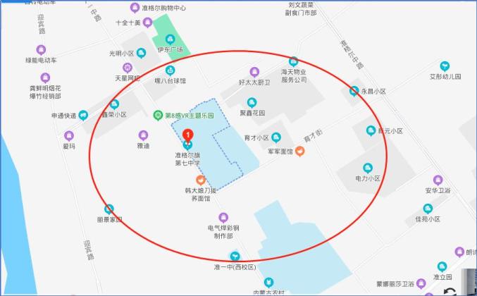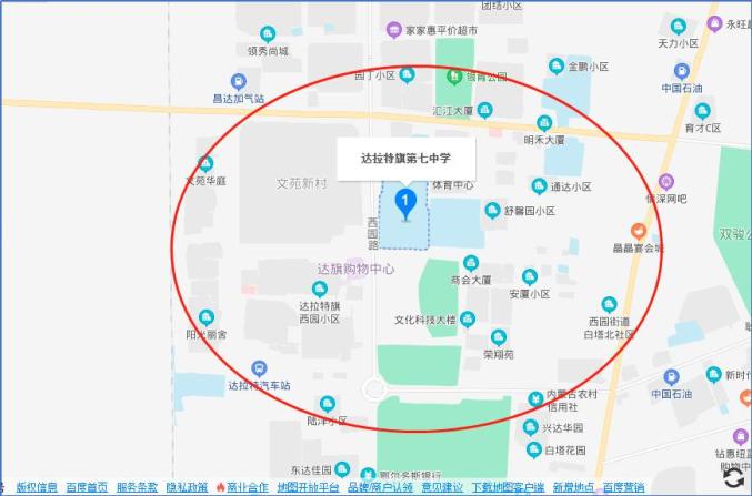 影响范围:达旗五中、达旗八中:达旗育才(ABC)小区、裕隆新苑、达旗五中、达旗武装部、达旗工业街、美林家园、锦绣华庭、维多利小区、维多利华府小区、达旗四完小、召西居委会、市政管理局、召南社区服务中心、北国花苑、杨柳村、富豪嘉园、腾达社区、腾达商场、汇金时代广场、王贵新村北面平房、万通家和小区、北国新天地、达旗人民医院等附近区域及周边道路。达拉特旗第七中学