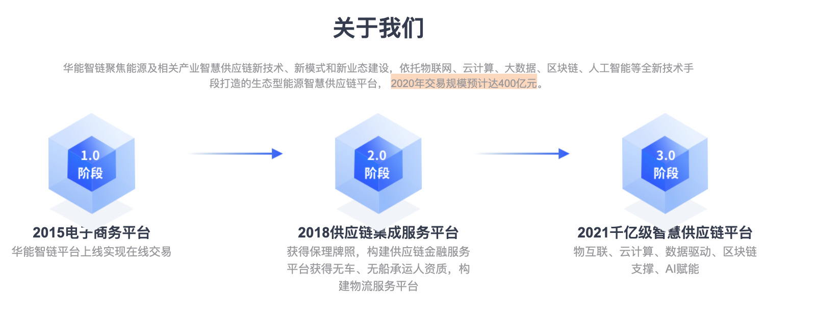“华能智链聚焦能源及相关产业智慧供应链新技术、新模式和新业态建设,依托物联网、云计算、大数据、区块链、人工智能等全新技术手段打造的生态型能源智慧供应链平台, 2020年交易规模预计达400亿元。”华能智链官方网站披露显示。