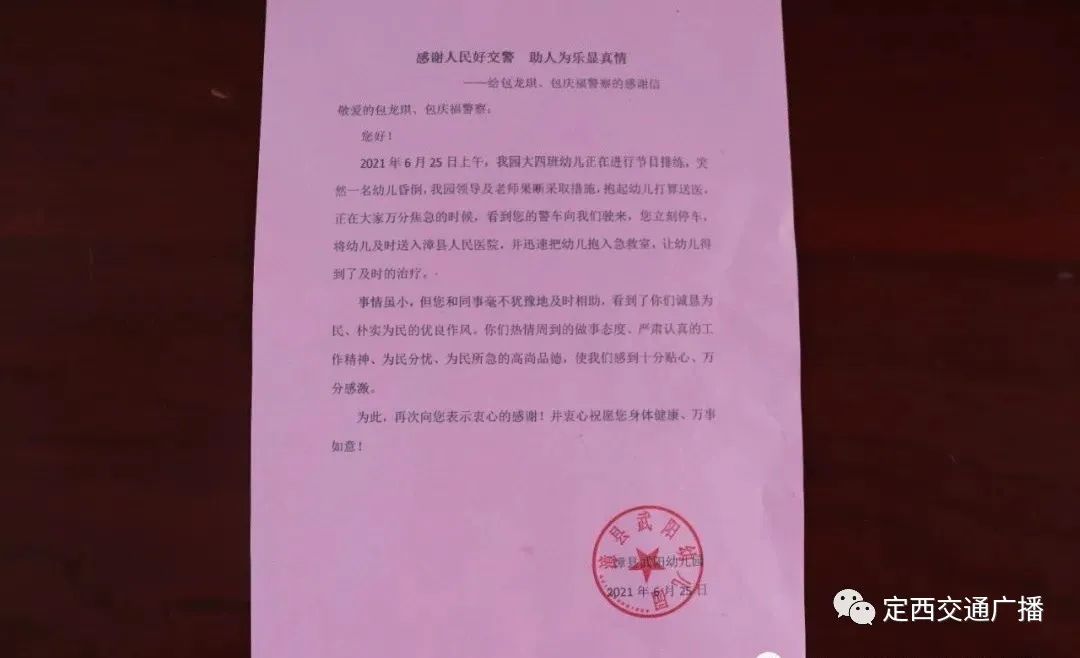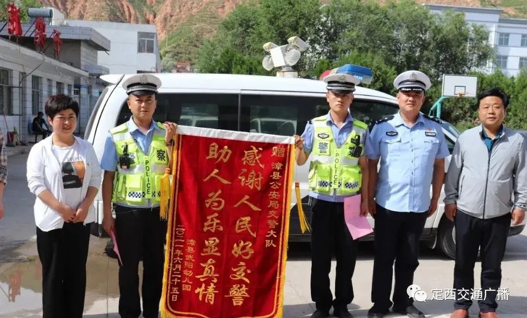 25日下午,幼儿家长在县教育局工作人员和武阳幼儿园园长、老师的陪同下专门来到交警大队,向城区中队赠送“感谢人民好交警,助人为乐显真情”锦旗,并向包龙琦、 包庆福两位同志送上了感谢信,衷心表达对人民交警为人民的感激之情。素材来源:漳县公安交警