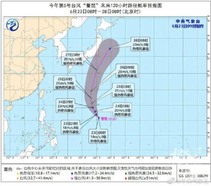 据中央气象台:今年第5号台风“蔷琵”(热带风暴级;英文名称:Champi;名字来源:老挝;名称意义:一种花)已于昨天(6月23日)上午在西北太平洋洋面上生成,预计,“蔷琵”将以每小时10-15公里的速度向西北方向移动,强度将有所加强,最强可达热带风暴级或强热带风暴级(23-28米/秒,9-10级);26日以后,“蔷琵”在日本东南部洋面转向东北方向移动,并逐渐减弱变性 。“蔷琵”未来对我国近海无影响。