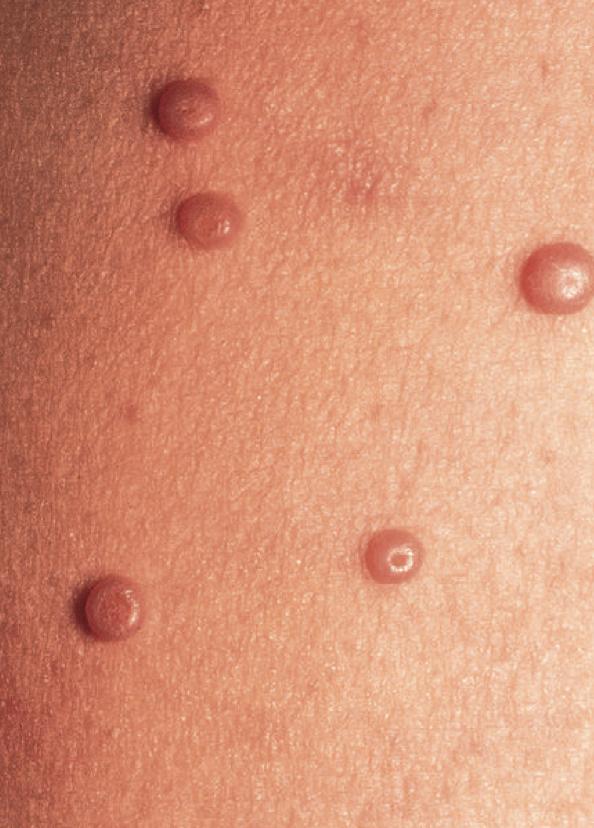这是痘病毒科的传染性软疣病毒感染引起的一种疾病。临床表现为一个一个“小粒粒”,没什么感觉,有时会发炎变红,典型损害,中央可见到轻微的凹陷,内有白色的小点(脐凹)。