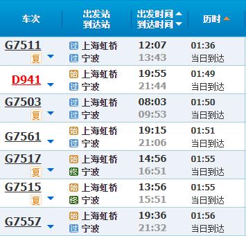 部分车次信息宁波