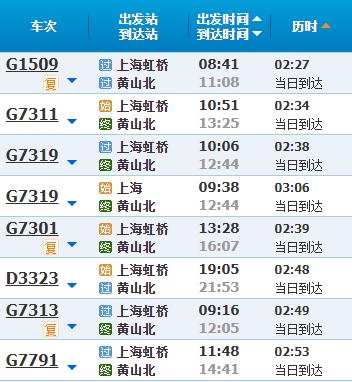 部分车次信息黄山