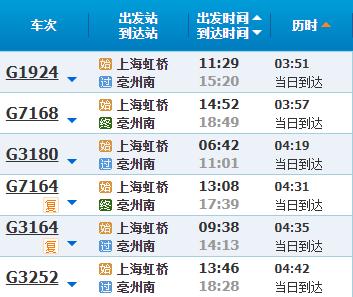 部分车次信息亳州