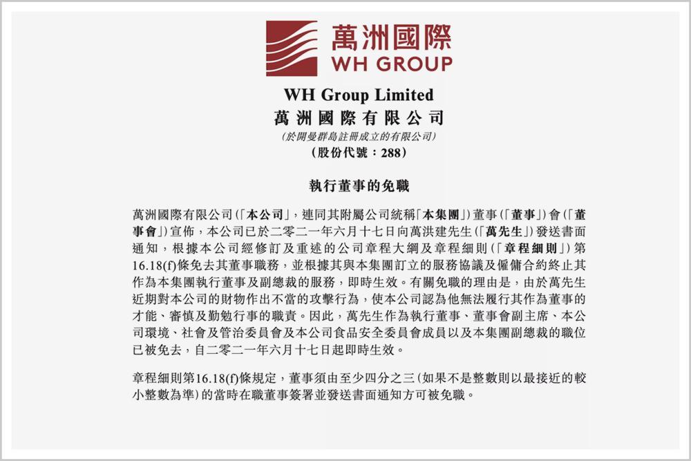 根据万洲国际公告,万洪建不但被免除了执行董事、董事会副主席、集团副总裁的职位,包括其作为万洲国际环境、社会及管治委员会及食品安全委员会成员的身份,也都没了。