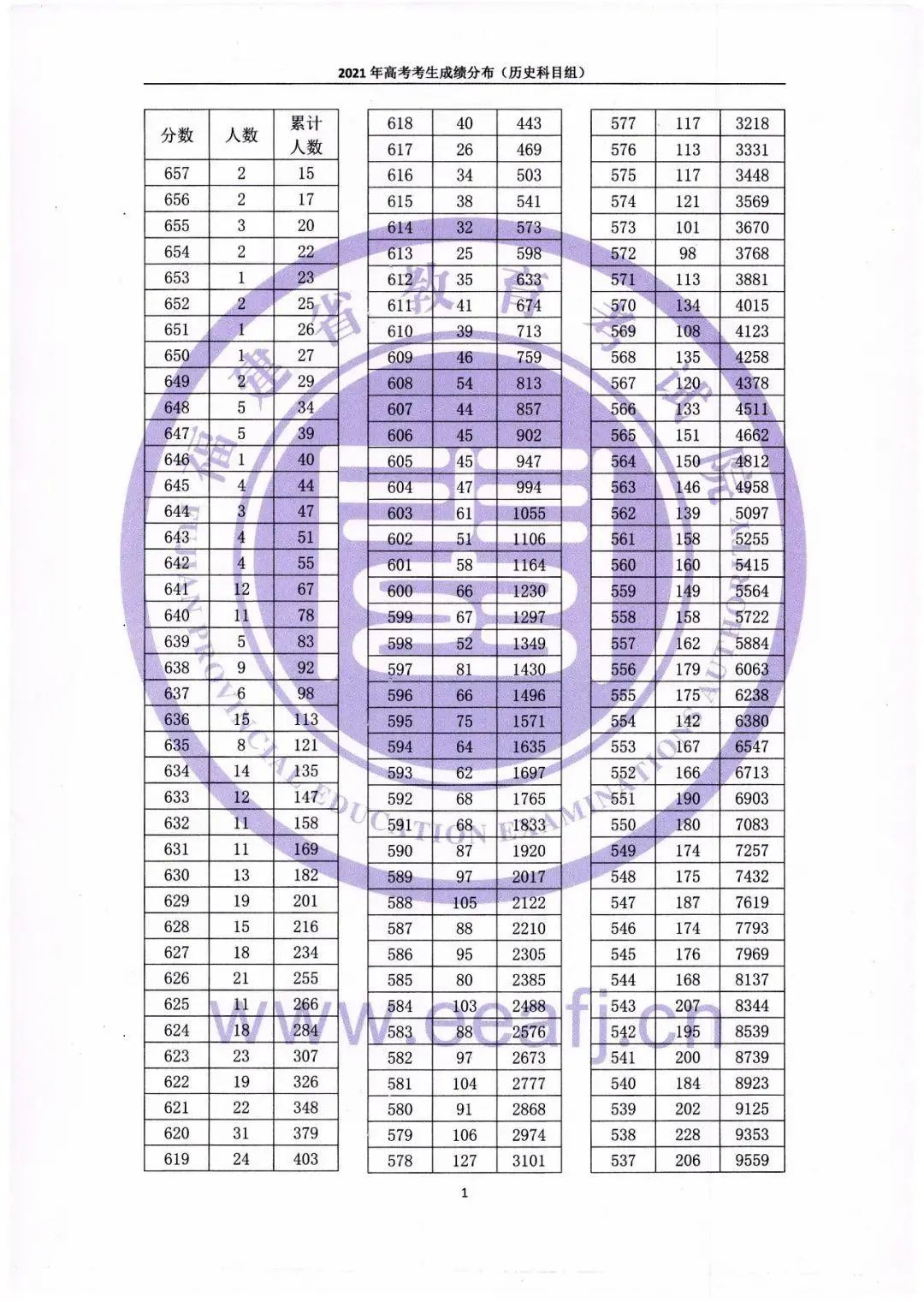 全省历史科目组657分以上考生有15人,546分(特殊类型考生录取控制分数线)以上的考生有7793人,467分(本科批)以上的考生有29506人。