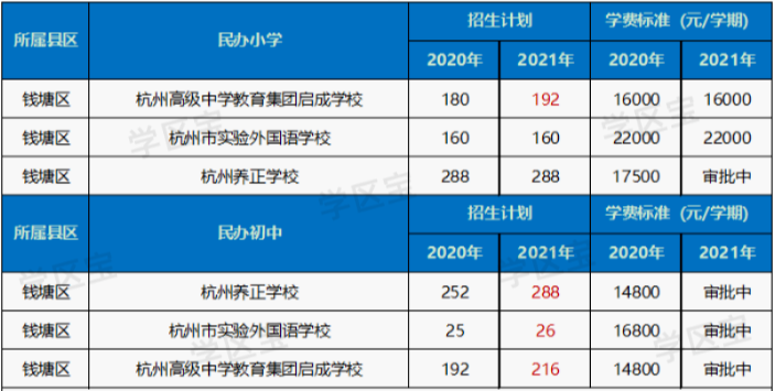 钱塘区几所民办学校都是九年一贯制学校,几所学校小学部学费保持平稳,初中部招生计划都有所扩招,同时,均表示学费会有调整,正在审批中。