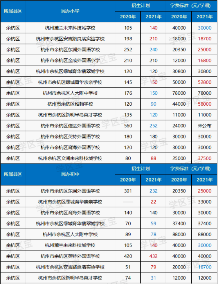 余杭区的民办学校很多,其中九年一贯制也比较多,小学部学费有上涨的学校比较多,初中部保持平稳,整体情况跟萧山相似,低的有1万出头,高的接近9万。