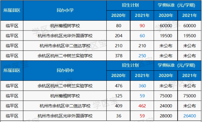 临平区几所学校学费都是保持平稳的,但是招生计划变化比较大,其中,光华外国语学校小学部、杭二树兰实验学校缩招都比较多。
