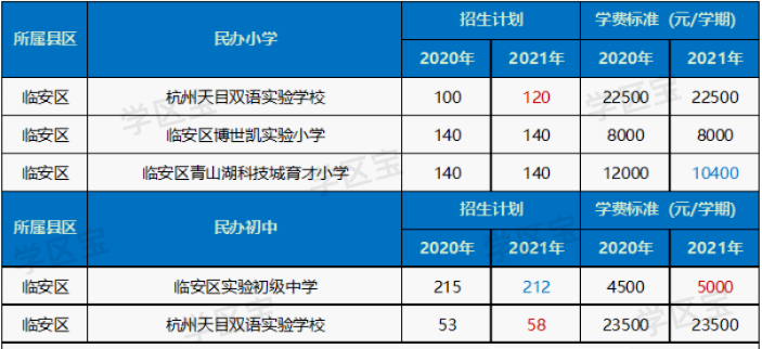 临安区几所民办学校学费保持平稳,仅有临安实验初中略涨500,但整体还是本区最低的。