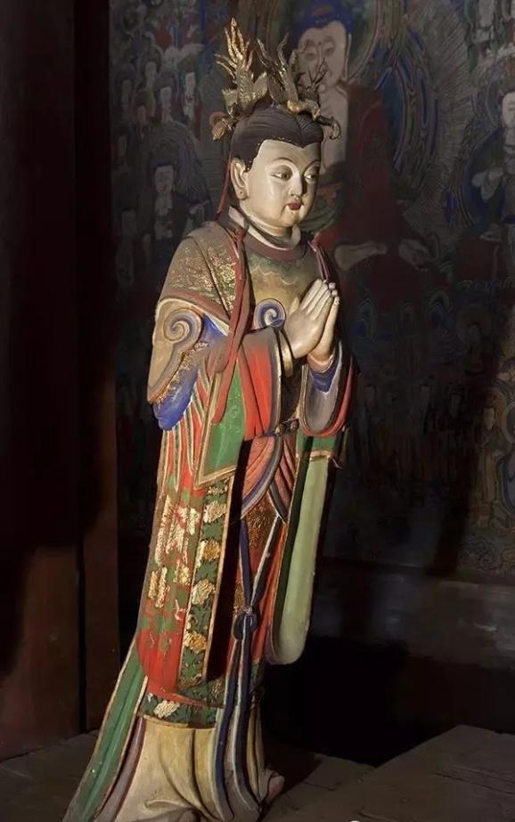 位置:南侧诸天佛台西一,通高:3.16米,肩宽:0.681米。女相,头戴凤冠,背着披帛,胸配云牌,身着霞披,拱手合十,身姿庄重。