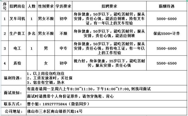工作地点:佛山三水区南山镇漫江工业区康裕一路(乐华恒业卫浴)