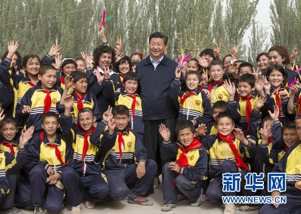 2014年的春天,在新疆考察工作的习近平总书记走进疏附县托克扎克镇中心小学。了解到全校共12个班,全部开设双语课程,有很好的教学设施后,总书记很高兴。他来到六年级一班教室,听两名学生朗读课文《做客喀什》的部分段落,夸赞她们汉语识字量大、发音准、读得好。操场上,看见总书记来了,孩子们围拢过来,总书记同他们合影,临别时,孩子们高喊着“欢迎习爷爷再来”,总书记向他们挥手告别。