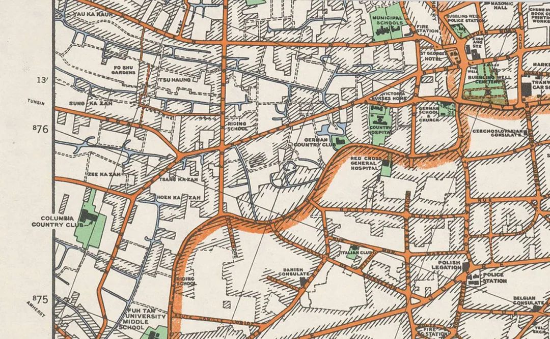 1933年沪西地图,其中左上角区域为越界筑路地区。/wiki夏衍在《懒寻旧梦录》里也曾有记叙:“北四川路、史高脱路、窦乐安路(现多伦路)一带是所谓‘越界筑路’地段,也是日本人集中居住的地区,名义上是公共租界,实质上归日本人统治,这儿很少有白人巡捕,也没有印度‘三道头’,当然,国民党警察也不能在这个地区巡逻。”