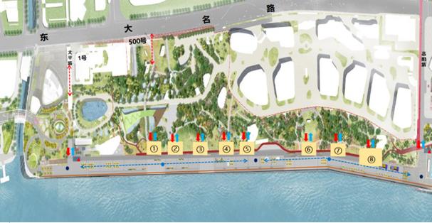 此外,作为北外滩滨江国客中心码头880米岸线提质贯通配套工程,国家AAAA景区“上港邮轮城”也进行了整体景观升级改造,市民游客可以从太平路和高阳路步行至码头,或自东大名路穿过上港邮轮城景区从图示1-8号口位置步行至码头。